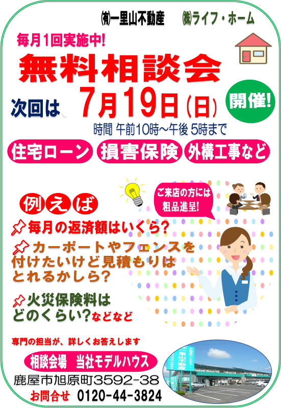 次回の、開催日≪無料相談会≫7/19日 ※住宅ローン、外構工事、損害保険など
